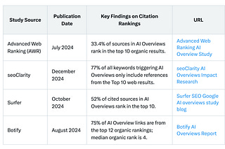 Different AI Overviews related studies have found that mostly it cites URLs which are already ranking on first page of search results.